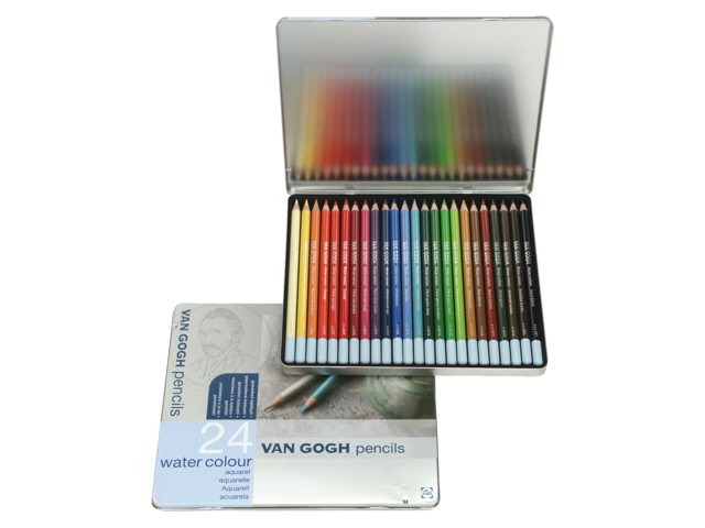 Van Gogh’i kunstniku tasemega vees lahustuvad värvipliatsid, Pehmed, kõrge pigmendisisalduse ja valguskindlusega. Pliiatsid on valmistatud seedripuust ning neid on lihtne teritada. Metallkarbis komplekt sisaldab järgmisi värve: Napoli kollane hele(222), permanen kollane hele (283), permanent kollane tume (285), oranž (235), permanent punane light (370), punakaslilla (334), permanent punane lilla (348), permanent punane violetne (567) ), permanent sinine violetne (568), phthalo-sinine punane (583), ultramariin (504), taevasinine (527), türkiissinine (522), permanent roheline tume (619), permanent roheline keskmine (614), permanent roheline hele (618), permanent kollakasroheline (633), kollane ooker (227), naturaalne sienna (234), põletatud sienna (411), oliivroheline (620), rohekas umbra (410), Vandyke Brown (403), elevandiluusmust ( 701).