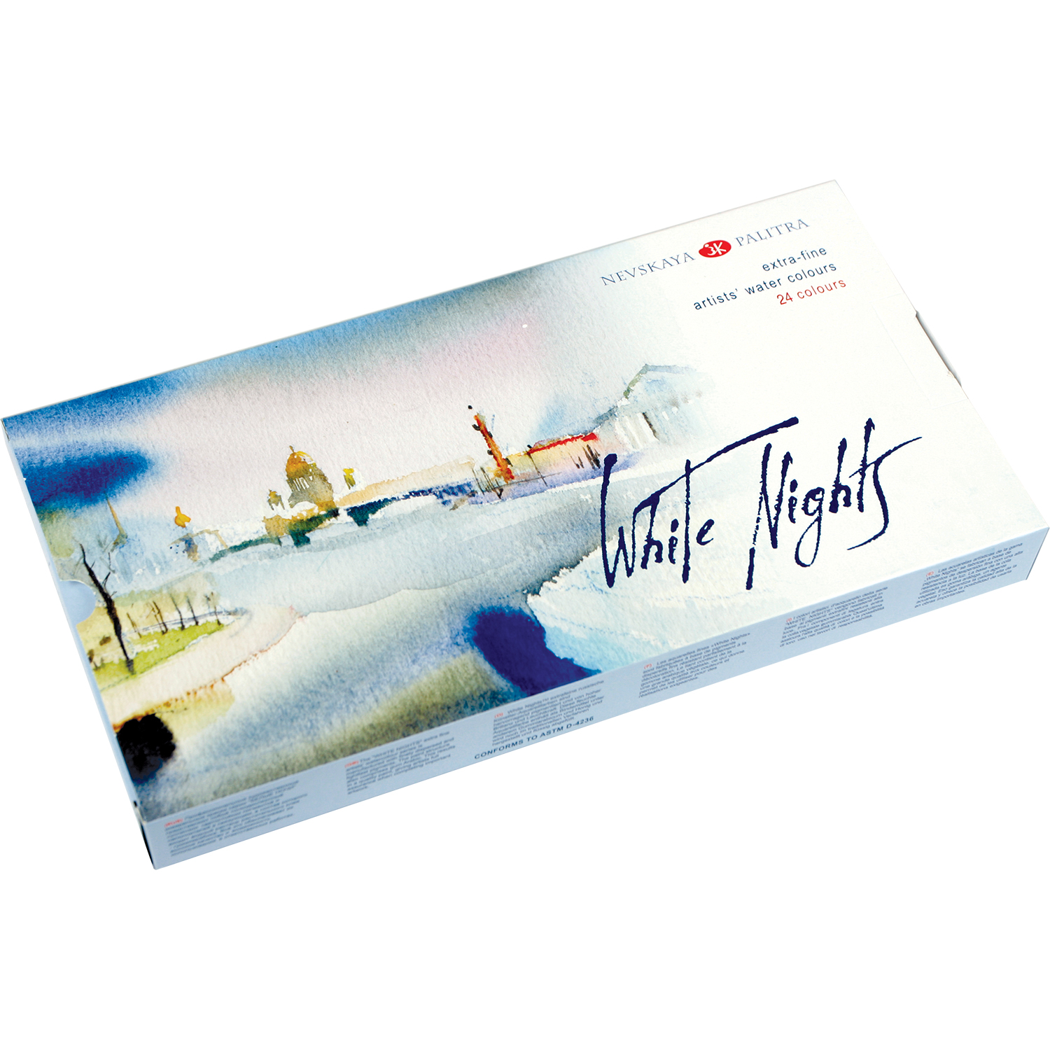 Professionaalsed akvarellvärvid “Valged ööd” on peenelt hajutatud pigmentide ja täiteainete suspensioonid sideaines, mis sisaldab taimse liimi vesilahust – kummiaraabikut. Akvarellvärvid on ohutud, sertifitseeritud ja vastavad ASTM D-4236 standarditele.