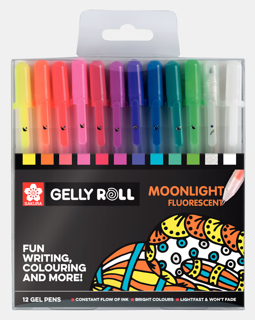 Komplekt sisaldab fluorestsentskollane (403), fluorestsentsoranž (405), fluorestsentsvermillion (418), fluorestsentsroosa (420), punane (419), roosa (421), lilla (424), sinine (436), roheline (429), fluorestsentsroheline (427), värvitu (700), valge (50). Sakura geelpliiatsid sisaldavad spetsiaalset veepõhist geelivärvi, mis annab erksad ja intensiivsed värvid, mis kunagi ei tuhmu. Tänu ainulaadsele tehnoloogiale on tindi voog pliiatsilt alati püsiv, ilma survet avaldamata. Gelly Roll Moonlight® omab Gelly Roll® perekonna heledamaid ja erksamaid värve. Kreemjas, sile, läbipaistmatu tint sobib suurepäraselt joonistamiseks ja värvimiseks. Kõik värvid on valgel paberil heledad ja annavad mustal paberil silmapaistvaid efekte ning fluorestsentsed helendavad pimeduses.