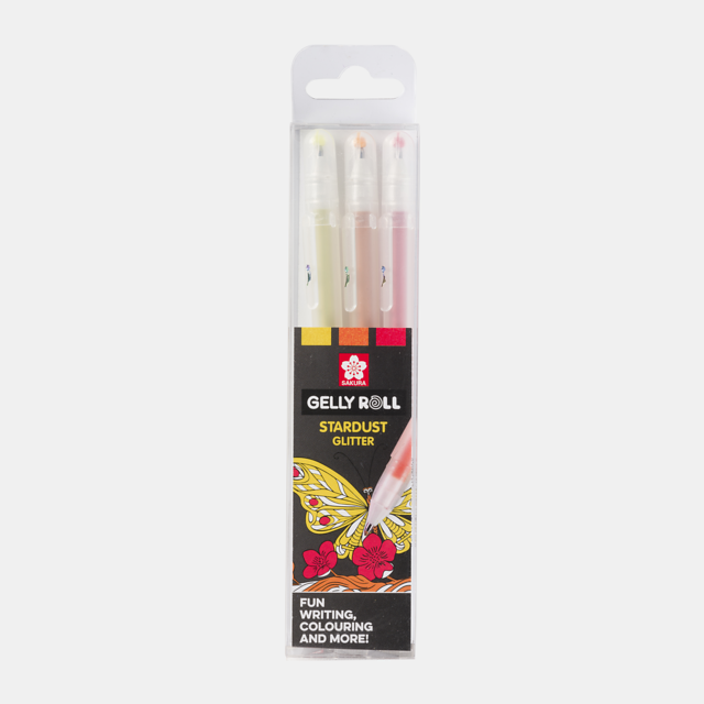 Säravad geelpliiatsid. Parimad tulemused Stardust geelpliiatsiga saavutatakse heledal, valgel ja mattpaberil. Sobib suurepäraselt ka akvarellimiseks. Sakura Gelly Roll sisaldab spetsiaalset veepõhist pleekimiskindlat pigmentgeeli. Tänu ainulaadsele geelvärvi tehnoloogiale on tindi vool pliiatsist alati pidev, survet avaldamata.